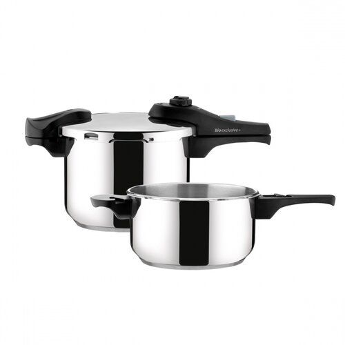 A BIO EXCLUSIVE+ Duo kukta készlet két edényt 4.0 + 6.0 l és egy univerzális fedőt tartalmas. A kukták első osztályú rozsdamentes acélból készültek, lehetővé teszik az alacsony és magas nyomás alatt történő főzést, ideálisak az ételek gyors és egyszerre gazdaságos elkészítéséhez. A biztonságos használat érdekében a kuktákat 4 biztosítékkal és masszív fogantyúkkal látták el. A háromrétegű szendvics alj minden típusú tűzhelyre alkalmas - gáz, villany, üvegkerámia és indukciós. A készlet nem tartalmaz pároló rostot, sem fedőt. 5 év garancia.