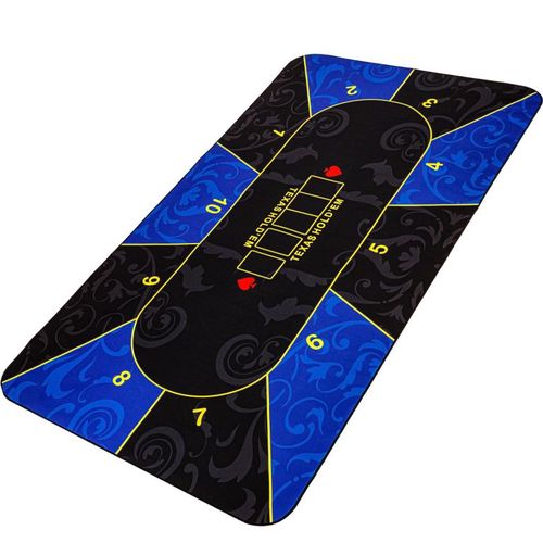 A pókerszőnyeg max 10 játékos számára alkalmas. Az elülső része vízálló poliamidból készült, az anyaga pedig kellemesen puha és sima tapintású (hasonló az egérpárnához) Termék részletek: méretek: 200 x 90 cm max 10 játékos számára készült vastagság: 3 mm színe: kék-fekete a pókerszőnyeg feltekerhető hordozható táska: igen